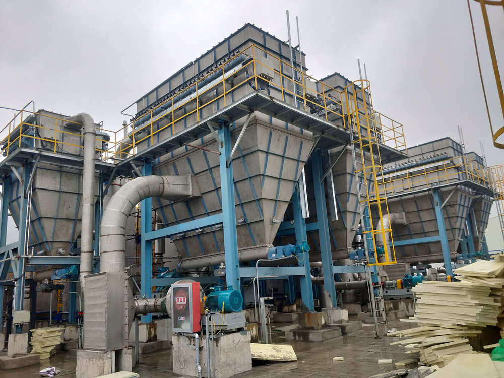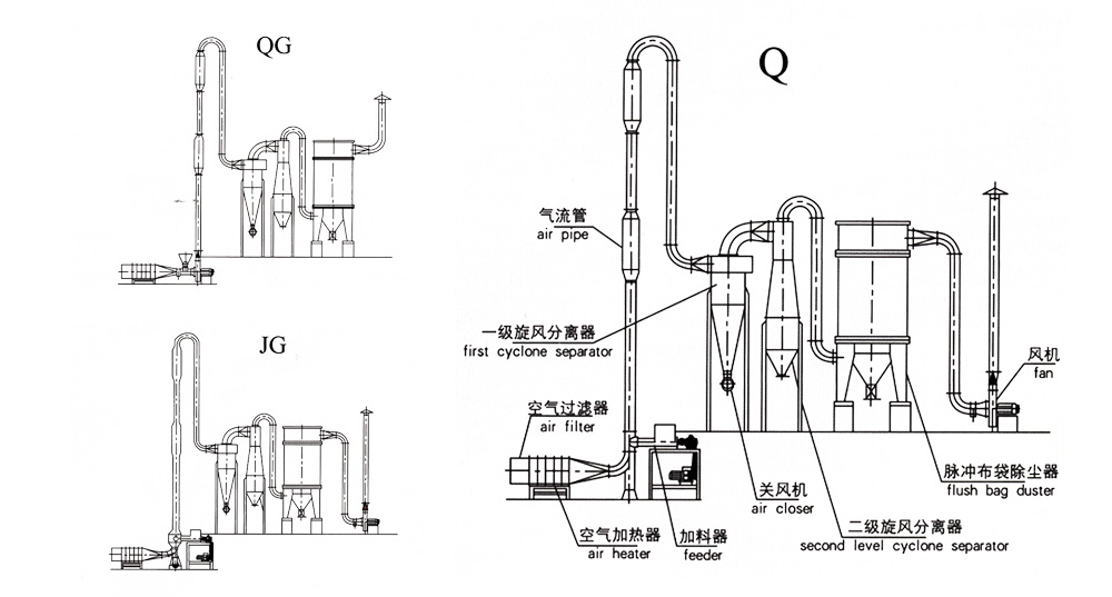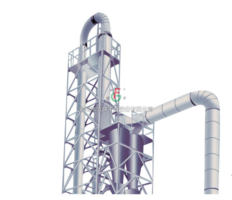 濕物料經(jīng)輸送機(jī)與加熱后的自然空氣同時進(jìn)入干燥器,二者充分混和,由于熱質(zhì)交換面積大,從而在很短的時間內(nèi)達(dá)到蒸發(fā)干燥的目的。干燥后的成品從旋風(fēng)分離器排出,一小部飛粉由旋風(fēng)除塵器或布袋除塵器得到回收利用。Q型氣流干燥器是負(fù)壓操作,物料不經(jīng)過風(fēng)機(jī);QG型氣流干燥器是正壓操作;物料經(jīng)過風(fēng)機(jī)帶有粉碎作用;FG型氣流干燥器是尾氣循環(huán)型;JG型氣流干燥器是強(qiáng)化型氣流干燥器,其集閃蒸干燥與氣流干燥為一體,是我公司根據(jù)用戶要求設(shè)計的新型干燥設(shè)備。
