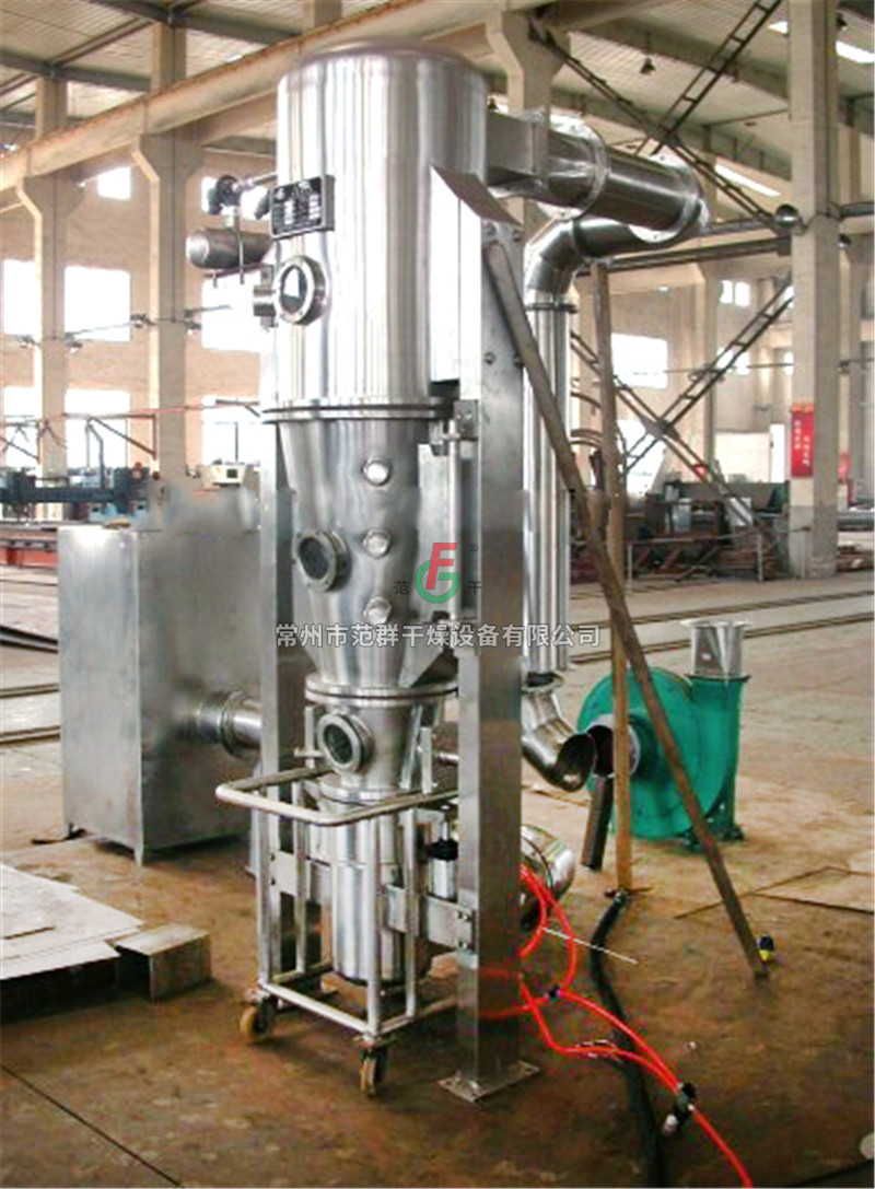 系統風機將新鮮空氣從過濾器、加熱器吸入。經凈化、加熱后的空氣從制粒器下部篩網穿過。高速氣流維持粉末物料懸浮,形成穩定的流化床。作為粘結劑的溶液經輸液泵壓送到噴槍后,象霧一樣的噴射到干燥室中的粉末上,使粉末凝聚成多孔狀顆粒,粒子形成后,按預定周期在干燥器中干燥,含濕空氣經干燥器頂部防靜電袋濾器捕集粉塵后排至室外。