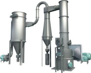 閃蒸干燥機主要由進風系統、加熱系統、加料系統、干燥主機、收料除塵系統、排風系統、控制系統等組成。工作時,濕物料由螺旋加料器進入干燥室,物料在干燥室中與高速旋轉的熱風相遇,細粉狀物料被熱風帶著向干燥室上端移動,不能帶走的物料落在干燥室底部,被底部的粉碎裝置打碎,物料被迅速分散,物料與熱風的接觸面積迅速增大。在離心力的作用下(頂部有分級裝置),達到干燥程度和一定細度的產品被吹出分級裝置,物料在此過程中得到快速干燥。