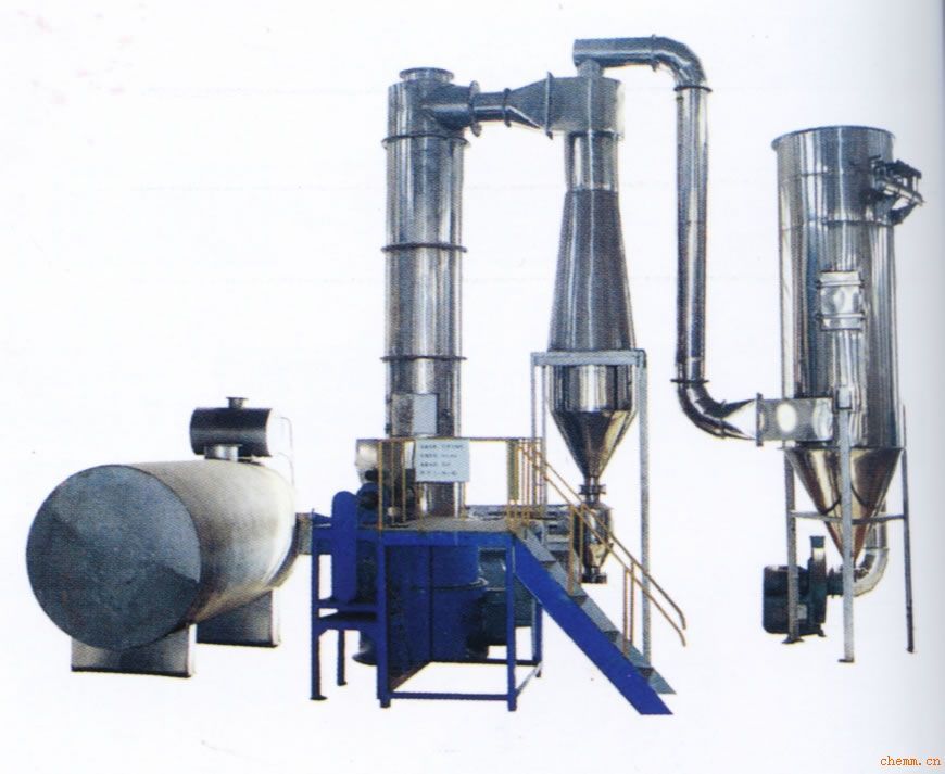 旋轉閃蒸干燥機的熱空氣入口管適當噴出速度從干燥機底部的混合粉碎干燥室,強烈的剪切、撞擊、摩擦材料、顆粒強化傳熱,傳質在干燥器的底部,大于濕顆粒組機械破碎在攪拌器的作用下,水分含量低,粒度越小,顆粒夾帶的旋轉流動增加,進一步干燥在上升的過程中,由于氣固兩相旋轉流動,固相慣性大于氣相,兩個階段的氣體的相對速度較大,并加強兩個傳熱、傳質和機器生產高強度。