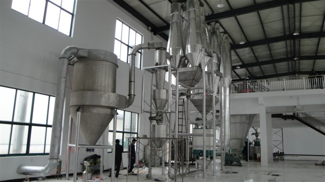 加熱到一定溫度后吹入直立管,在管內(nèi)的速度決定于濕顆粒的大小和密度,一般大于顆粒的沉降速度(約為10~20米/秒)。已干燥的顆粒被強烈氣流帶出,送到兩個并聯(lián)的旋風分離器分離出來,經(jīng)螺旋輸送器送出,尾氣則經(jīng)袋式過濾器放空。由于停留時間短,對某些產(chǎn)品往往須采用二級或多級串聯(lián)流程。